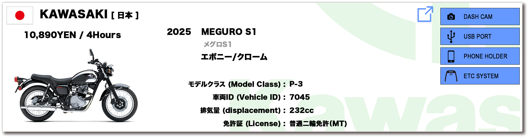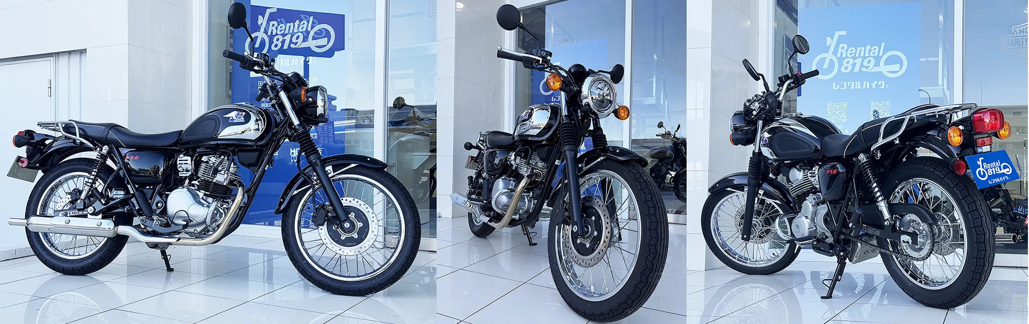 私個人の好みはW230よりメグロS1の方が好きです。メグロS1はメッキ部品も使用して。タンク等の仕上げも綺麗なバイクです。ネオクラシックスタイルのデザインで、ボディもコンパクトで、軽い気持ちでツーリングに出かけることができる。ホンダGB350Cよりボディがコンパクトなので、なるべき軽量なオートバイを希望する方には、メグロS1をお勧めします。リアキャリアとエンジンガードも装備しています。レンタル819西宮のレンタルバイクには、ドライブレコーダーを標準装備していますので、もしもの事故の際の証拠になります。是非一度メグロS1をレンタルしてみて下さい。ご予約お待ちしております。