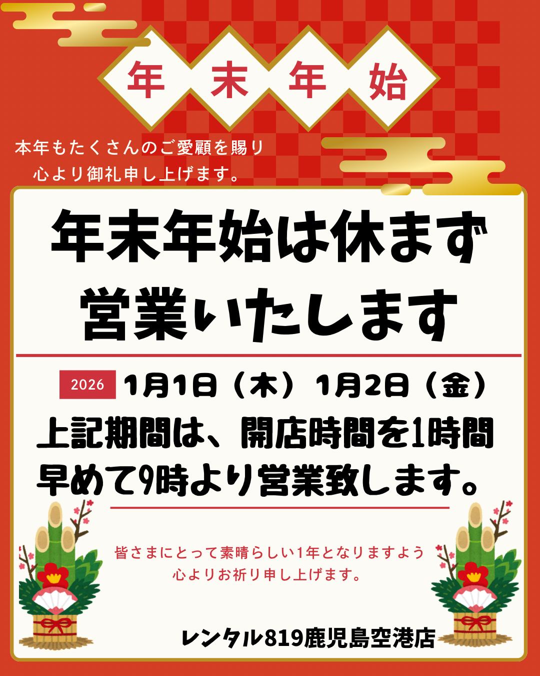 2026年1月1日、2日は普段より1時間早めて9時より営業を行います!