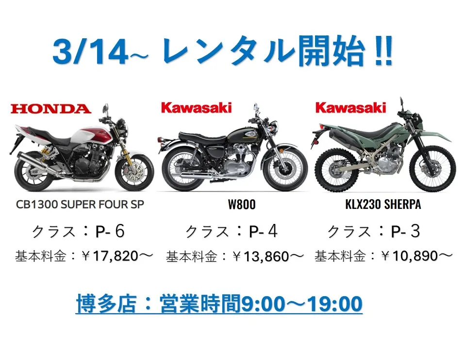 明日3/14(土曜日)AM9時オープン~ 新車種3台のレンタルを開始します。